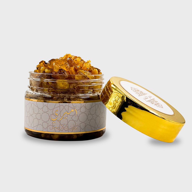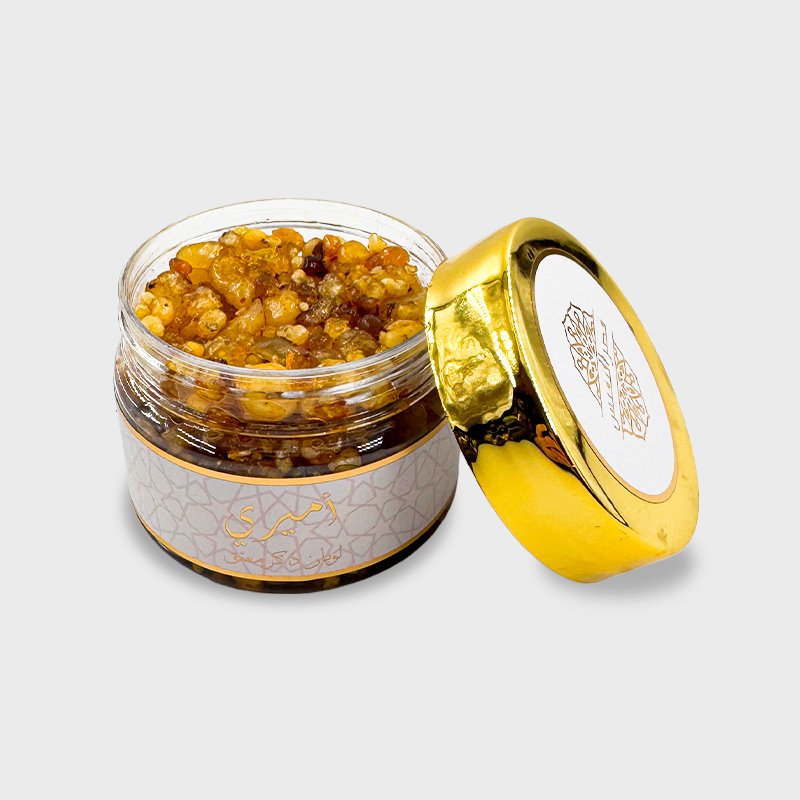 لبان أميري من قصر النفيس، تركيبة عطرية ناعمة وفاخرة تجمع بين نوتات خفيفة من العود، خشب الصندل الدافئ، الفانيليا، السكر، ولمسة من اللافندر المنعشة.
